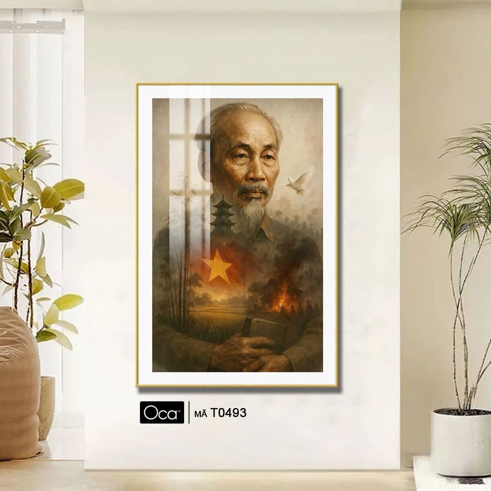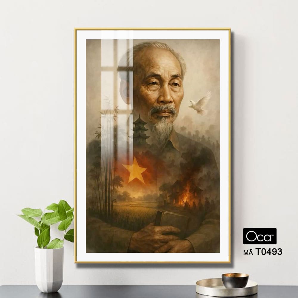 Hình ảnh trung tâm thường là Bác Hồ với gương mặt hiền từ, ánh mắt chan chứa yêu thương, bàn tay Người đặt lên trái tim – biểu tượng cho tấm lòng nhân ái, bao dung và trung kiên với lý tưởng cách mạng. Nền tranh được thể hiện bằng gam màu đỏ, vàng và trắng – tượng trưng cho tình yêu nước, niềm tin và ánh sáng của dân tộc. Ánh sáng tỏa ra từ trái tim Bác lan khắp bức tranh, như ngọn lửa soi đường, sưởi ấm tâm hồn bao thế hệ người Việt Nam.