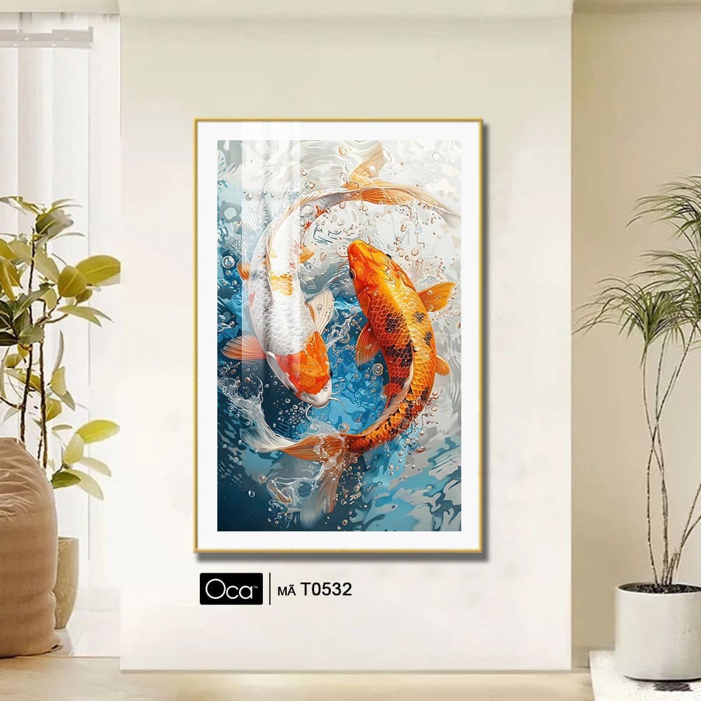 “Bức tranh “Song Ngư Hóa Long” là một kiệt tác nghệ thuật mang đậm ý nghĩa may mắn, thăng hoa và thành công vượt bậc, lấy cảm hứng từ huyền thoại cá chép hóa rồng – biểu tượng cho ý chí kiên cường và khát vọng vươn tới đỉnh cao. Trong bức tranh, hai chú cá chép uốn mình mạnh mẽ giữa làn sóng nước, vảy óng ánh sắc vàng và cam đỏ, thân hình uyển chuyển như đang chuẩn bị vút lên trời để hóa rồng trong ánh sáng rực rỡ. Toàn bộ khung cảnh toát lên sức mạnh, năng lượng và tinh thần bền bỉ vượt qua thử thách.