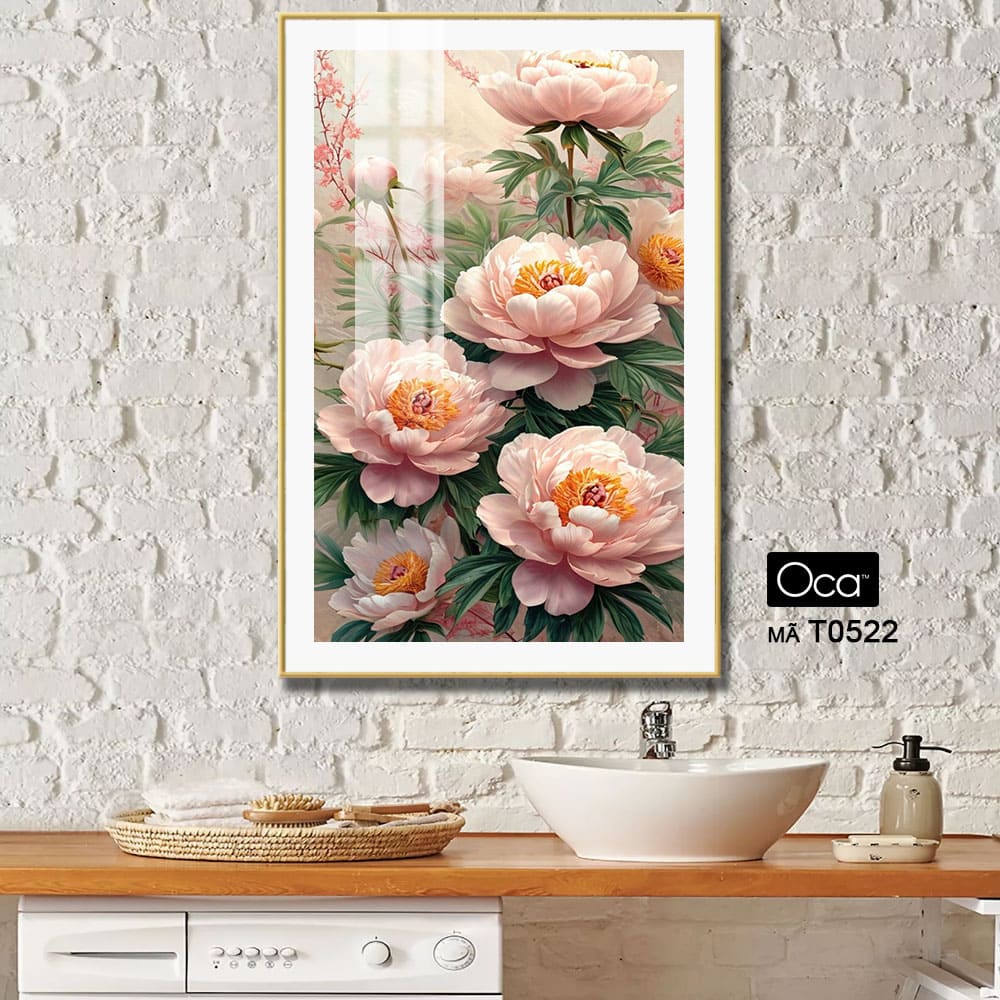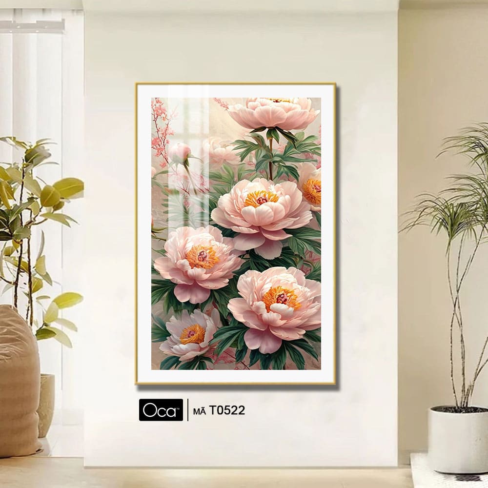 “Bức tranh “Khóm hoa Mẫu Đơn” là một tác phẩm hội họa tinh tế, sang trọng và đầy ý nghĩa, được xem như biểu tượng của phú quý, vinh hoa và hạnh phúc viên mãn. Trung tâm bức tranh là hình ảnh một khóm mẫu đơn đang nở rộ, những bông hoa lớn, nhiều lớp cánh mềm mại xếp chồng lên nhau, tạo nên vẻ đẹp đầy đặn, kiêu sa và quyến rũ. Dưới ánh sáng nhẹ, từng cánh hoa ánh lên sắc hồng, đỏ, tím hoặc vàng nhạt, hòa cùng màu xanh mướt của lá, khiến toàn bộ bức tranh bừng sáng, thanh nhã và tràn đầy sức sống.