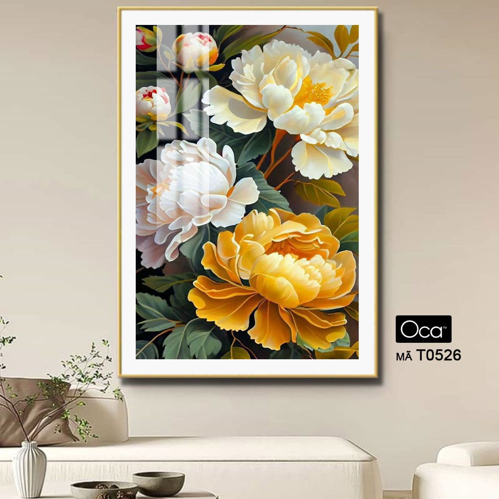 “Bức tranh “Khóm hoa Mẫu Đơn” là biểu tượng tuyệt mỹ của vẻ đẹp phú quý, sang trọng và viên mãn, được thể hiện qua từng đường nét tinh tế và sắc màu rực rỡ. Trung tâm bức tranh là một khóm mẫu đơn đang nở rộ, những bông hoa lớn với từng lớp cánh mềm mại, xếp chồng uyển chuyển như lụa, tỏa sáng trong sắc đỏ thắm, hồng phấn hoặc vàng ánh kim. Mỗi cánh hoa như đang hé nụ cười kiêu sa giữa nắng sớm, lan tỏa vẻ đẹp quý phái và sức sống dồi dào, khiến người xem không khỏi mê đắm.