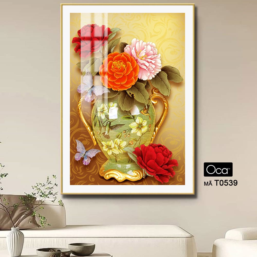 “Bức tranh “Bình hoa Mẫu Đơn” là một tác phẩm nghệ thuật tinh tế, mang vẻ đẹp sang trọng, kiêu sa và đầy sức sống, thể hiện sự hòa quyện giữa thiên nhiên tươi đẹp và nghệ thuật hội họa tinh xảo. Trung tâm bức tranh là một bình hoa chứa những bông mẫu đơn nở rộ, cánh hoa mềm mại, xếp lớp uyển chuyển, tỏa ra ánh sáng dịu dàng nhưng rực rỡ. Sắc hoa hồng thắm, đỏ tươi hoặc vàng nhạt nổi bật trên nền lá xanh tươi mát và bình hoa trang nhã, tạo nên tổng thể hài hòa, cân đối và tràn đầy năng lượng tích cực.