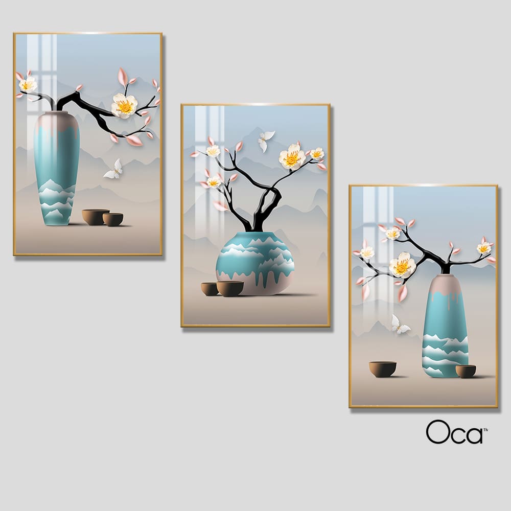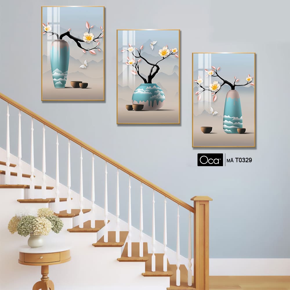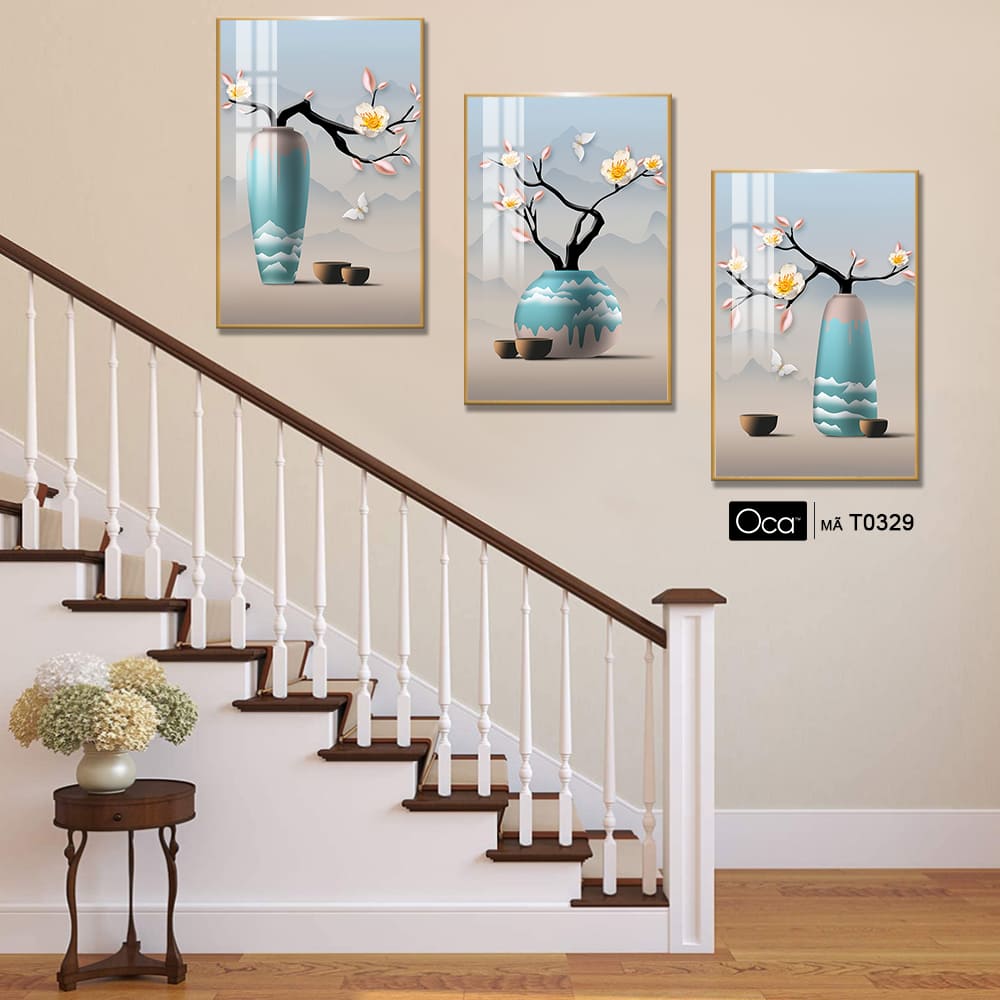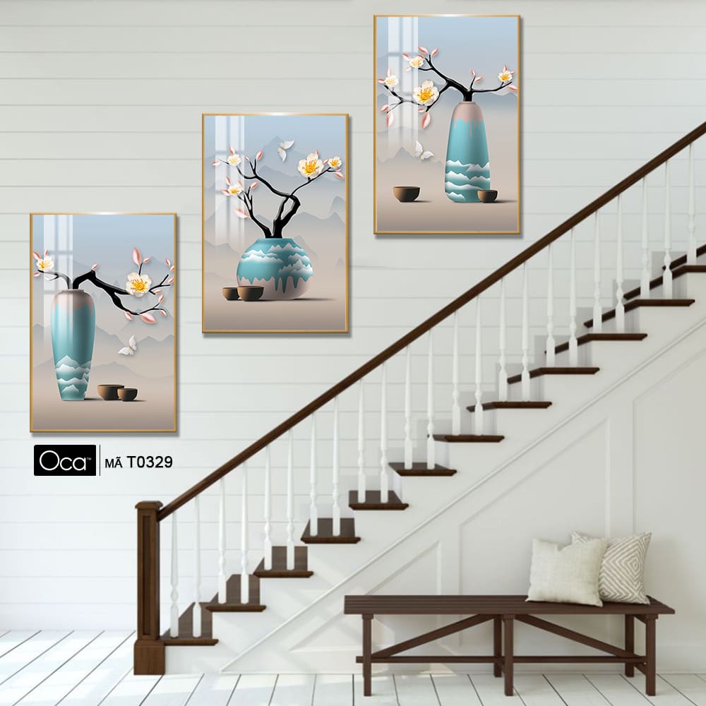 Bình hoa mai | Bộ 3 tranh treo cầu thang | Mã T0329 | Oca