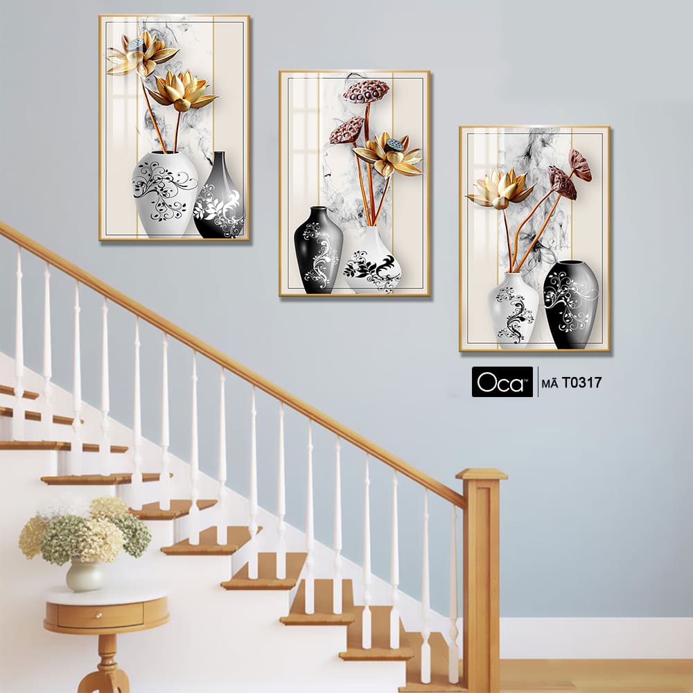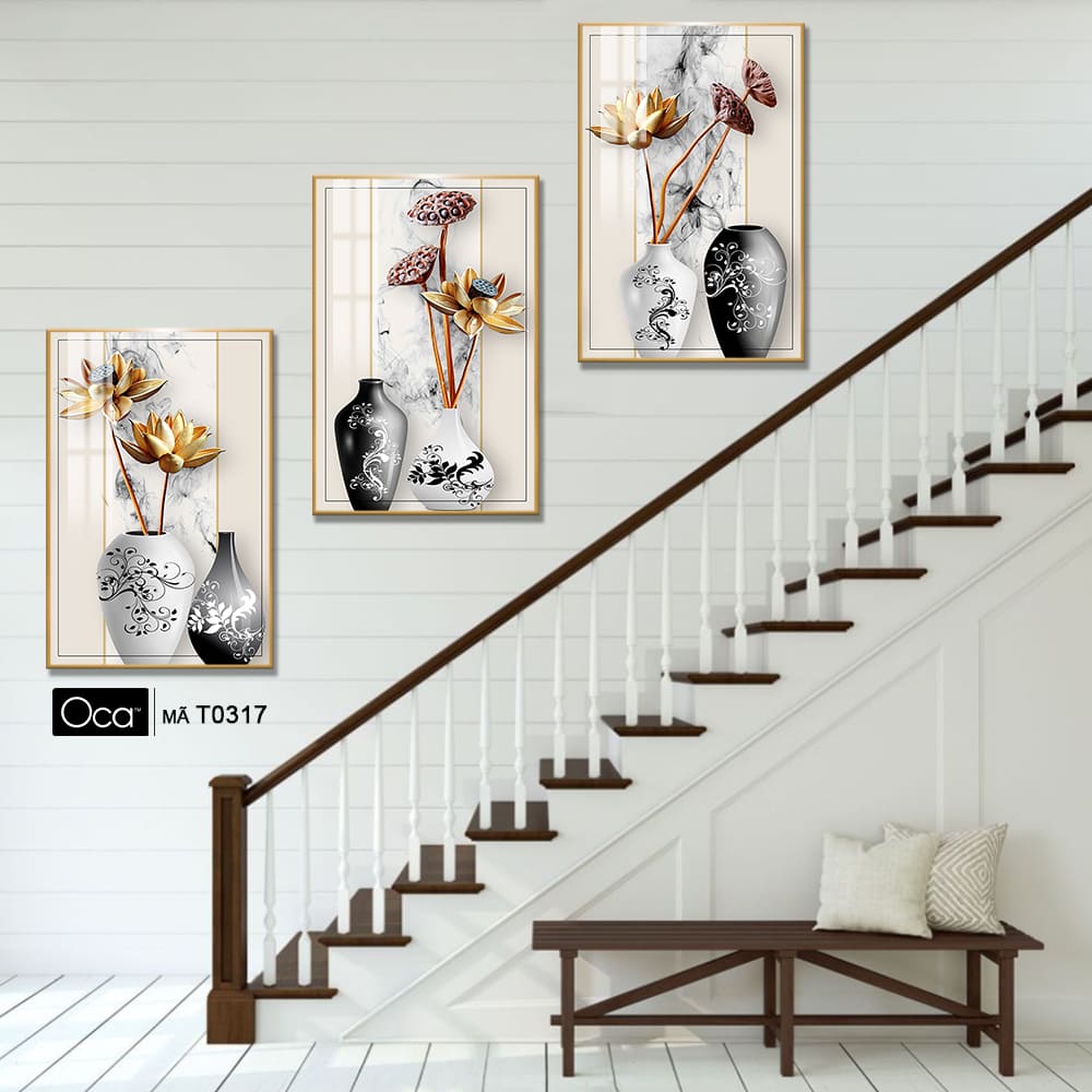 Bình hoa sen | Bộ 3 tranh treo cầu thang | Mã T0317 | Oca
