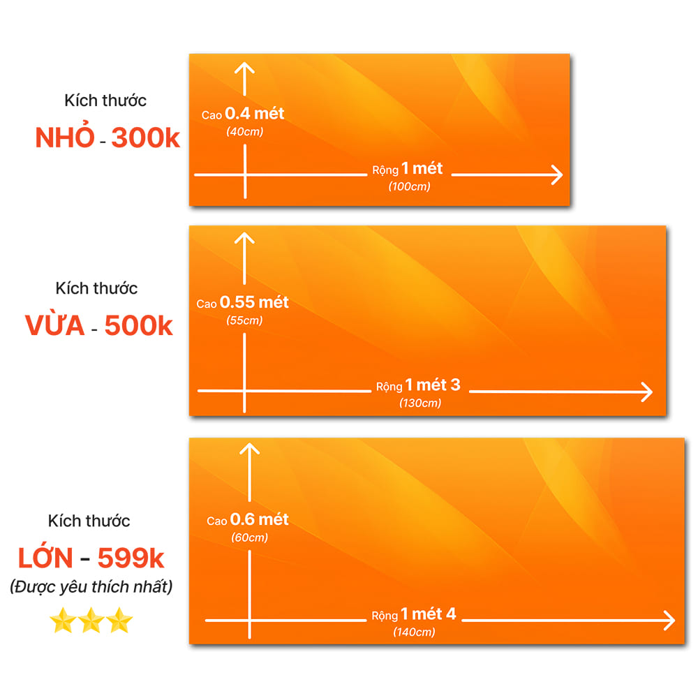 | Kích thước | Chọn kích thước CAO CẤP (60×140) (khuyên dùng), Chọn kích thước TRUNG BÌNH (55×130), Chọn kích thước NHỎ (40×100) |