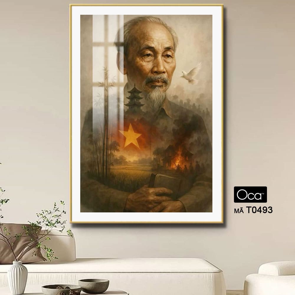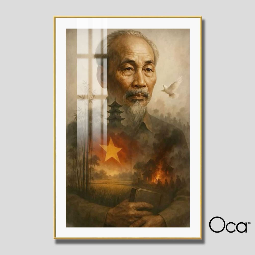Hình ảnh trung tâm thường là Bác Hồ với gương mặt hiền từ, ánh mắt chan chứa yêu thương, bàn tay Người đặt lên trái tim – biểu tượng cho tấm lòng nhân ái, bao dung và trung kiên với lý tưởng cách mạng. Nền tranh được thể hiện bằng gam màu đỏ, vàng và trắng – tượng trưng cho tình yêu nước, niềm tin và ánh sáng của dân tộc. Ánh sáng tỏa ra từ trái tim Bác lan khắp bức tranh, như ngọn lửa soi đường, sưởi ấm tâm hồn bao thế hệ người Việt Nam.