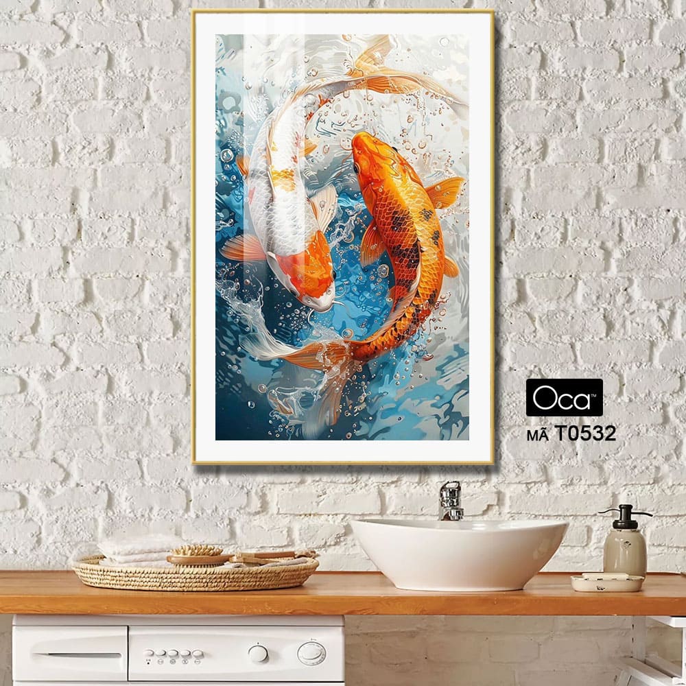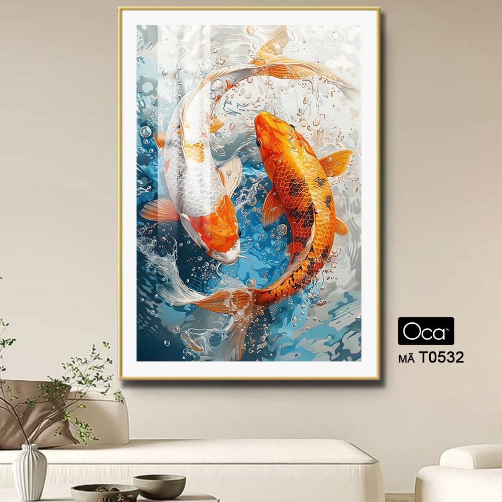 “Bức tranh “Song Ngư Hóa Long” là một kiệt tác nghệ thuật mang đậm ý nghĩa may mắn, thăng hoa và thành công vượt bậc, lấy cảm hứng từ huyền thoại cá chép hóa rồng – biểu tượng cho ý chí kiên cường và khát vọng vươn tới đỉnh cao. Trong bức tranh, hai chú cá chép uốn mình mạnh mẽ giữa làn sóng nước, vảy óng ánh sắc vàng và cam đỏ, thân hình uyển chuyển như đang chuẩn bị vút lên trời để hóa rồng trong ánh sáng rực rỡ. Toàn bộ khung cảnh toát lên sức mạnh, năng lượng và tinh thần bền bỉ vượt qua thử thách.