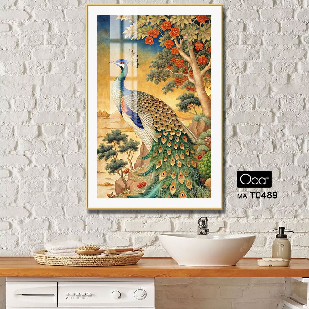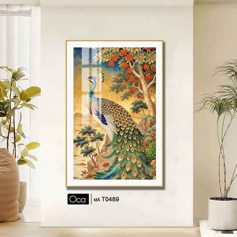 Bức tranh “Chim khổng tước” thường được thể hiện trên nền vàng nhạt hoặc xanh ngọc, giúp tôn lên vẻ lộng lẫy của đôi cánh và làm nổi bật phong thái quý phái của loài chim này. Ánh sáng phản chiếu từ bộ lông tựa như ngọc trai dưới ánh nắng, mang đến cảm giác vừa sang trọng, vừa tươi mát và đầy sinh khí. Với đường nét tinh xảo, bố cục cân đối và màu sắc hài hòa, bức tranh không chỉ là tác phẩm nghệ thuật trang trí cao cấp, mà còn là biểu tượng của sự thăng hoa, may mắn và thành công viên mãn trong cuộc sống.”