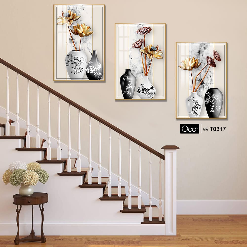 Bình hoa sen | Bộ 3 tranh treo cầu thang | Mã T0317 | Oca