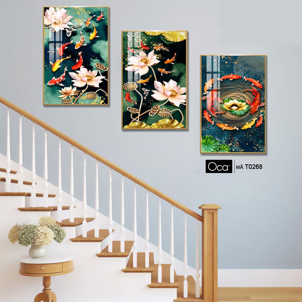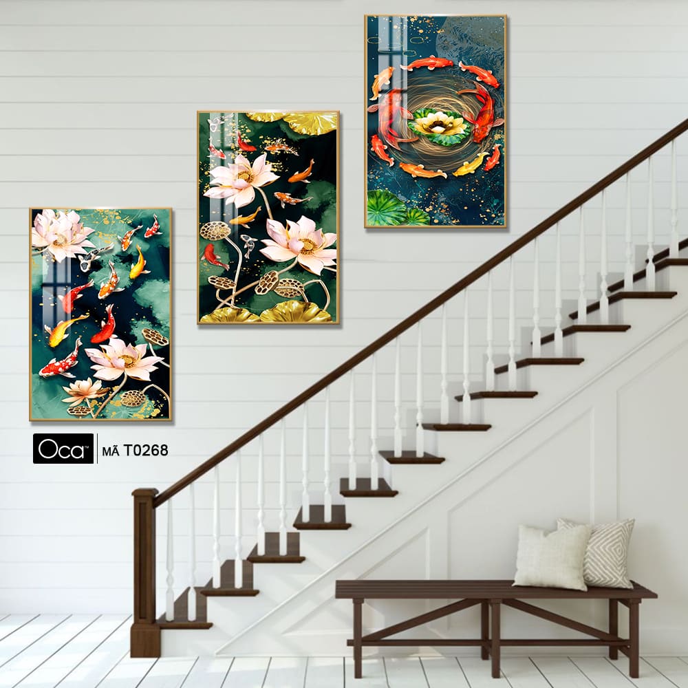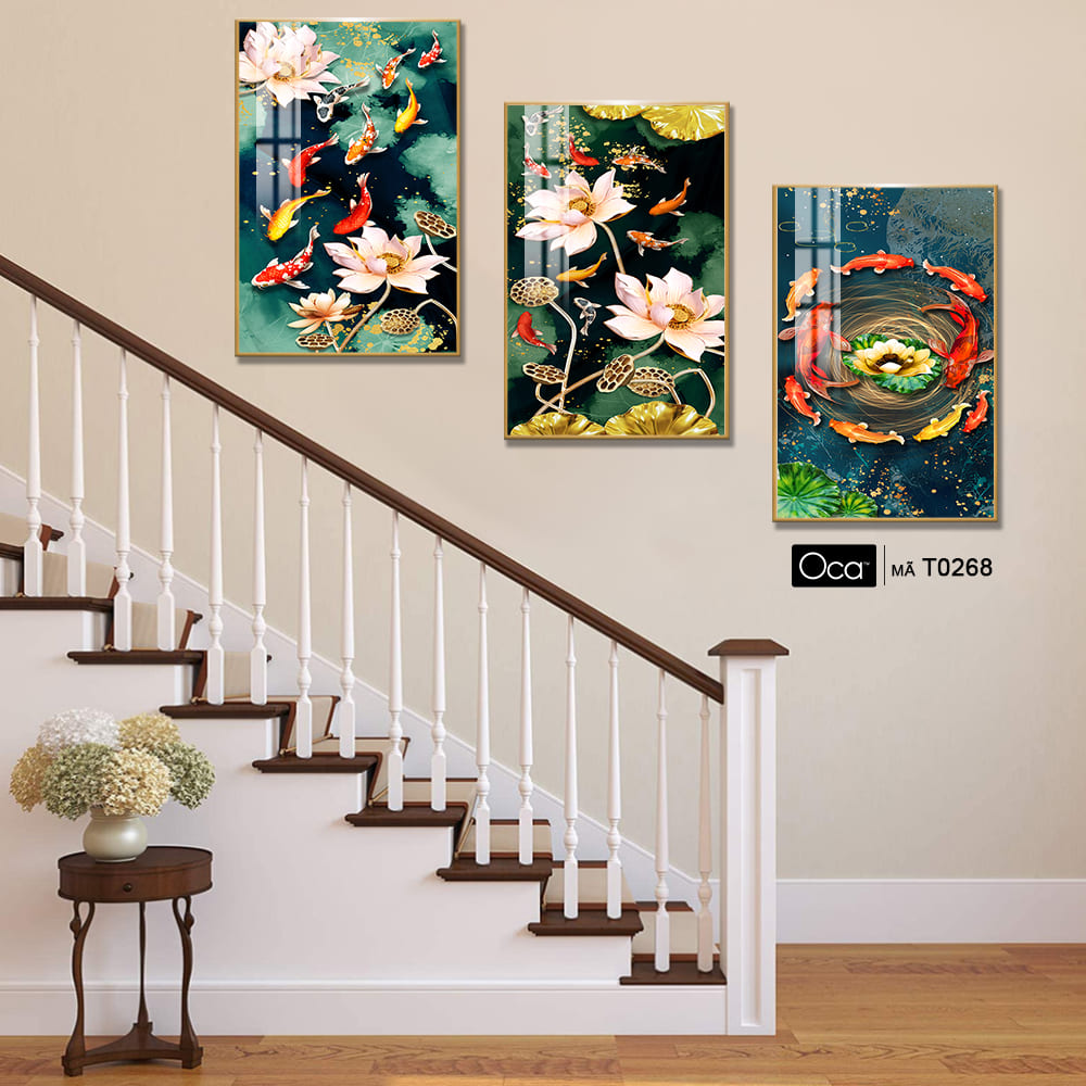 Cá chép trông trăng | Bộ 3 tranh treo cầu thang | Mã T0268 | Oca