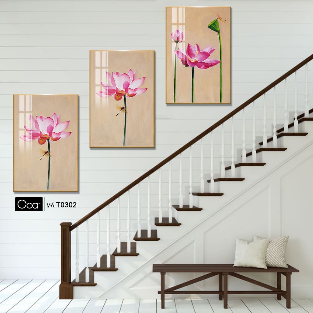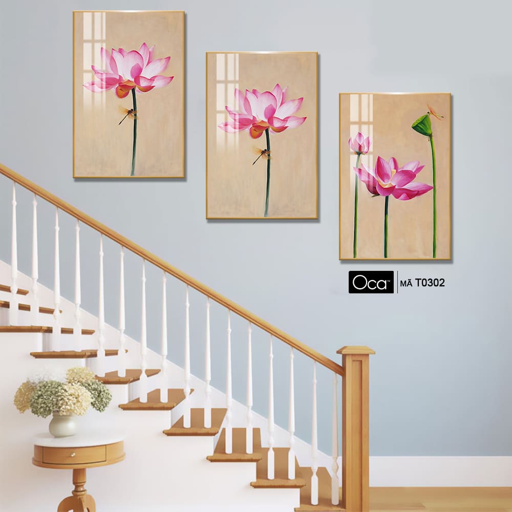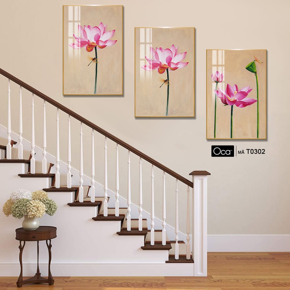 Hoa sen hồng | Bộ 3 tranh treo cầu thang | Mã T0302 | Oca
