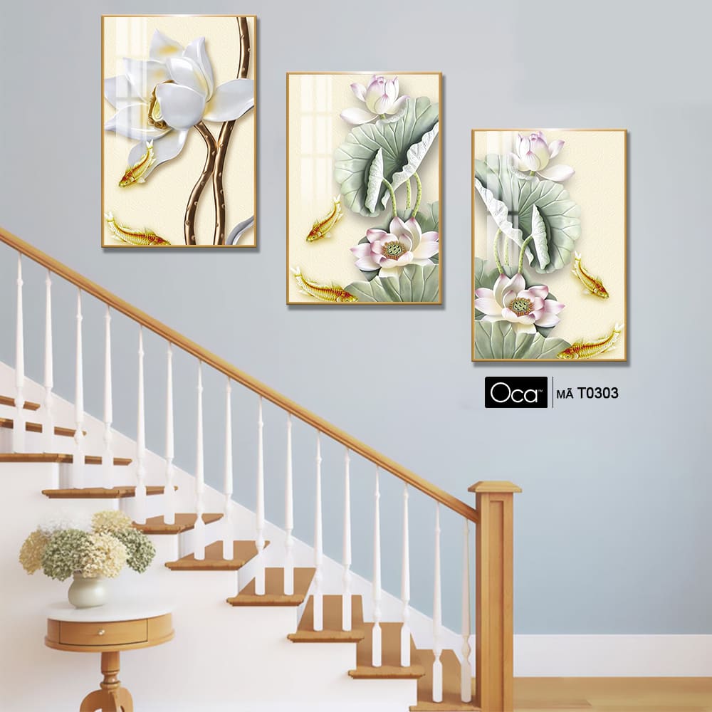 Hoa sen trong đầm | Bộ 3 tranh treo cầu thang | Mã T0303 | Oca