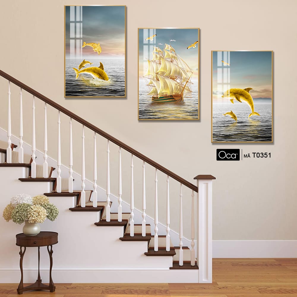 Hoàng hôn trên biển | Bộ 3 tranh treo cầu thang | Mã T0351 | Oca